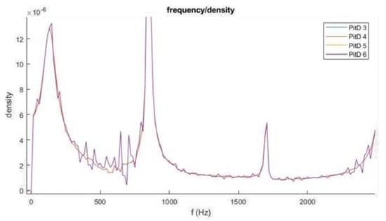 Positions 3 (having coordinates S = 36 and T = 0.5) and 4 (S = 36, T = −0.5) had the same radial coordinate (S = 36) but different axial coordinates (they lay on opposite sides of the flank). The two spectra were very similar and overlapped, as shown in Figure 12. The same could be observed for the spectra of positions 5 (S = 12, T = 0.5) and 6 (S = 12, T = −0.5). Therefore, it can be concluded that the data were not significantly affected by the axial position.