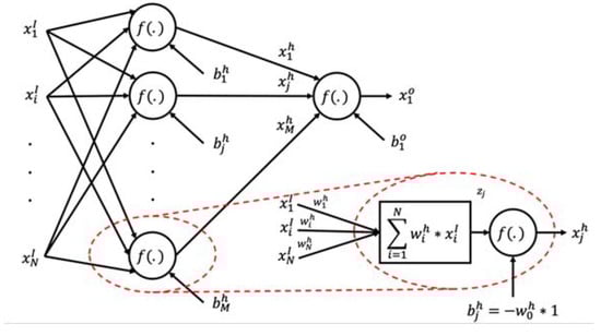 The general structure for the MLP is schematized in Figure 13. Each node i was connected to each node j in the preceding and the following layers through a connection of weights. Signals passed through each node as follows: in layer k (hidden layer), a weighted sum was performed at each node i of all the signals from the preceding layer, giving the excitation of the node; this was then passed through a nonlinear activation function f to emerge as the output node to the next layer; the activation function f in this case was restricted to . One node of the network, the bias node b, was special in that it was connected to all other nodes in the hidden and output layers; the output of the bias node was held fixed throughout to allow constant offsets in the excitations of each node. The response of node i is reported in Equation (3):