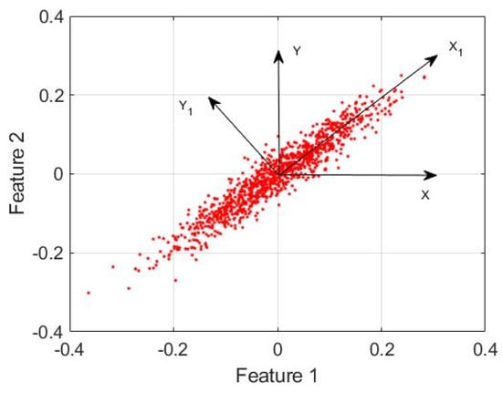 The PCA allows for dimensionality reduction by using the covariance matrix of the dataset to rotate the reference system and to obtain a more efficient data description. An example is presented in Figure 14, where a rotation of the reference system from to allows describing the dataset by using the new variable only, thus reducing the dataset dimensionality from 2 to 1.