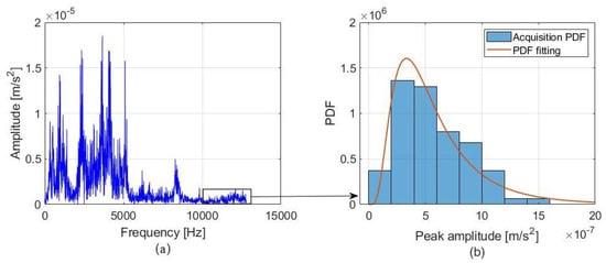 (a) FFT of vibration signal measured on the test bench and (b) PDF of the peaks in the range of 10–13 kHz.