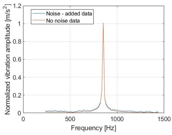 To superpose the effects of noise on the numerical FFT, an acquisition from the previously presented bench test was used (Figure 15a), specifically extracting the FFT peaks from 10 kHz to 13 kHz. The probability distribution function (PDF) of the peak amplitudes in the considered frequency range is presented in Figure 15b, where its approximation through a log-normal distribution is highlighted, with parameters reported in Table 2. The training dataset was thus artificially modified by adding a value sampled from the noise PDF to each FFT feature and for each sample, assuming the noise level was approximated as constant in the whole frequency range [0–13 kHz]. An example of FFT with added noise is presented in Figure 16.