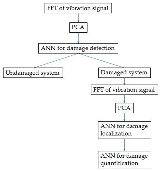 The procedure for ANN design and testing results are presented in this section. As shown in Figure 17, the damage identification inverse problem was subdivided into a three-step hierarchical structure, calling three separate ANNs to perform damage detection, localization, and quantification. The first ANN was used to classify whether damage was present or not; if damage was detected, two additional ANN regressors assessed the radial position and extent of the damage.