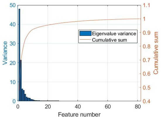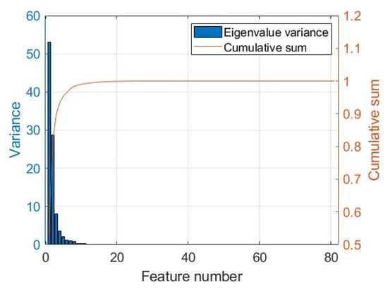 The dataset in Table 6 was used for localization ANN training; it was composed of 276 observation samples, including 81 features each. Also in this context, the PCA could be used to reduce the dataset dimensionality. It can be noticed in Figure 21 that more than 95% of the information within the signals was captured by considering the first 20 principal components of the dataset only.