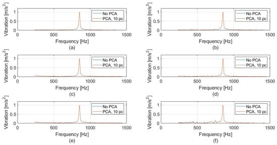 The PCA was applied to reduce the input-space dimensionality, thus allowing a more efficient ANN training. In Figure 18, the variance associated with each principal component of the detection dataset is presented, in which it is possible to see, by considering only the first 10 principal components, that it was possible to consider 99% of the total variance included in the dataset. As an example, six FFTs observed in presence of different damage extents were compared with their PCA reconstructions in Figure 19, specifically including just 10 out of 81 principal components. It is clear that a negligible error was made when considering the reduced input space when including the first 10 principal components only.