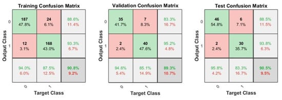 The classification ANN architecture included 10 input nodes, one binary output node, and 20 hidden nodes, with the latter defined based on trial-and-error procedure; however, as a compromise was made between training accuracy and generalization performance on test data never seen during training, to avoid overfitting. The ANN performances were synthetized with confusion matrices as shown in Figure 20, in which the similar performances in the training, validation, and test sets suggest the ANN possessed a high generalization capability, and no overfitting error occurred. Overall, less than 10% of misclassified examples were obtained.