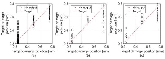 Thus, the first 20 principal components of the dataset were used to train the regression ANN for damage localization. The network architecture included 20 input nodes, one output node describing the radial position of the damage as a continuous variable, and 10 hidden nodes, again defined in a way to avoid overfitting. The ANN performances are presented in Figure 22, in which the training, validation, and test regression plots are shown. As the increasing trend was correctly captured by the ANN in all the subsets, it was possible to conclude that the algorithm could generalize on new data, and no overfitting occurred. It is worth noticing that the entire dataset was processed by the algorithm in Figure 22a–c, including small damages with reduced sensitivity.
