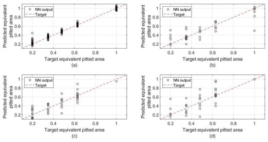 Quantification ANN performances: (a) training, (b) validation, (c) test with the correct damage location as input, and (d) test with the estimated damage location as input.