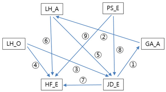 Transition of emotions and their mutual relationships among Love-Hate_Object (LH_O), Love-Hate_Agent (LH_A), Gratitude-Anger_Agent (GA_A), Pride-Shame_Event (PS_E), Joy-Distress_Event (JD_E), and Hope-Fear_Event (HF_E): ① An agent causing JD events, ② LH toward an agent may rise from the GA, ③ target of LH of objects is identified, ④ target of LH of objects is expected, ⑤ target of LH of agents is identified, ⑥ target of LH of agents is expected, and ⑦ HF is generated when JD is expected, ⑧ JD is produced when PS occurs, and ⑨ HF is produced when PS is expected to occur.