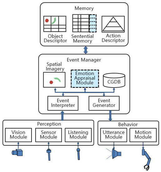 An emotion appraisal system based on the SCS is shown in Figure 4. The SCS consists of four functional blocks; a memory, an event manager, a perception, and a behavior [31]. Differently from previous SCSs, it has an emotion appraisal module (dotted line) in the event manager to appraise emotion in context. One of the merits of the proposed model is that the emotion appraisal is fulfilled based on the information of the SCS. The other advantage is that an emotion can be generated with context of cognitive information. In the SCS, an event is defined as newly recognized cognitive information different from the current state in the perception and behavior modules. The visual module, listening module, and sensing module receive information from the external environment. The utterance module and motion module exert action toward the environment. In the event manager, there is an event interpreter to represent an event to a sentence and to appraise the emotion of it, an event generator to produce such behaviors as utterance and motion, and schematic imagery to allocate objects virtually for spatial inference.