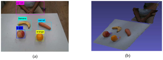 Figure 6 shows an RGB-D image and 3D recognition of objects in the vision module. Figure 6a shows object recognition results using Yolo from the RGB image, and Figure 6b shows the 3D view of table, which was transformed from the depth data with RGB texture mapping. In the 3D view, the center position of the object is identified on the planar coordinate system. The labels and positions of the objects are stored in the object descriptor.