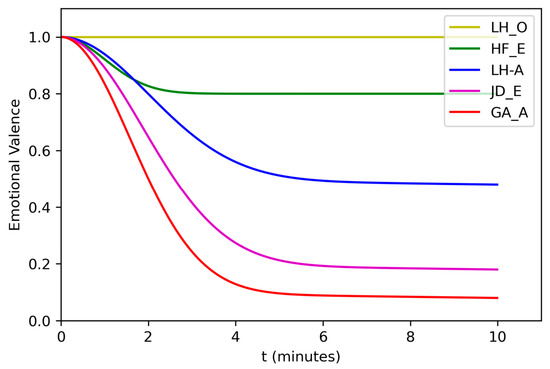 The variation of emotional intensity over time applying the parameters of the targets. In the case of LH_O, the intensity of emotional valance is 1 all of the time, which means a priori valence of the emotion to the fruits. The parameters for the emotion of LH_A has a long duration of the intensity and sustains the emotion with higher intensity than GA_A and JD_E. The intensity of HF_E has a short duration and long sustain with high values because the emotions of hope and fear could maintain high intensity for the future positive or negative events.