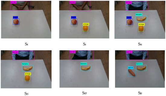 Figure 8 shows the results of object recognition of the series of events obtained using YOLO in the vision module, indicating the BBX and labels of objects. An agent was labeled as a person, each fruit was labeled, and the center positions of them were obtained from calculated coordinates by perspective transformation of the depth data.