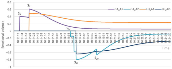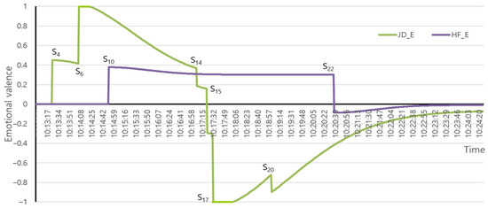 When it was predicted that the target of H_A1 would appear in the future with “See you tomorrow (S9),” the transition from LH_A (Figure 3,⑥) to HF_E happened at first with (0.5) and (0.8). When the robot heard the same sentence from A2, the valence of HF_E switched to negative and gradually shifted to neutral value.