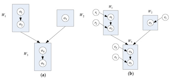 (a) Operations in three process agents and dependency among workflows; (b) dependency on resources for operations.