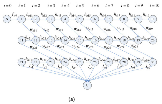 Consider a given graph with desired flow value . Note that Problem 3 is actually a minimum cost flow problem with additional constraints. It is well-known that a minimum cost flow problem can be solved by iteratively applying a shortest path algorithm such as the Dijkstra’s shortest path algorithm [48] or directly applying the algorithm for network flow problem [49]. The minimum cost flow problem is closely related to the problem to successfully find a number of shortest paths with total flows in these paths summing up to desired flow value . As the graph is an acyclic network with positive cost, the computational complexity is . Therefore, the complexity to construct and solve the minimum cost flow problem for is . As Problem 3 is actually a minimum cost flow problem with additional constraints. Therefore, a lower bound on the complexity to solve Problem 3 is .