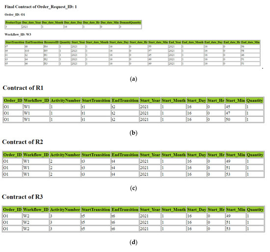 (a) Interactions between the task agent and process agents. (b) Interactions between process agent and resource agents and . (c) Interactions between process agent and resource agent . (d) Interactions between process agent and resource agents and .