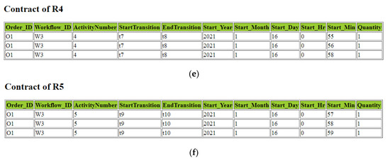 Without loss of generality, it is assumed that only the input transition in the Cyber World model of the first operation may have multiple input places, i.e., 1 and = 1 for . If this condition is not satisfied, we can decompose the workflow of a process agent into several subworkflows with multiple input places allowed only for the first operation in each subworkflow and assign each subworkflow to a process agent to make the above condition satisfied. Figure 7a–c show the DTPN models, , and for process agents , and , where = , = and = .