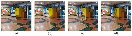 We captured picture sets using the built-in camera of a Samsung Galaxy 9 smartphone. There were more than 100 pictures in each set. The pictures within a single set were stitched using APIS to create the stereoscopic VR images. Figure 8 shows the left or right VR images of the stereoscopic VR images having holes of various sizes and locations. The VR images including the holes were used as test sets to evaluate the performances of the proposed algorithm and various conventional methods. In Figure 8a–f, the holes have been generated through the stitching algorithm owing to the reason described in Section 2. Those pictures are used only for subjective evaluations because there is no reference VR image without any hole. When we created Figure 8g,h, the stitched VR images did not have any holes. Therefore, we have made an artificial hole in each VR image. Consequently, Figure 8g,h can be used for objective evaluation, because the difference between the reference image (without any hole) and the concealed images (the results of various algorithms) can be calculated numerically.