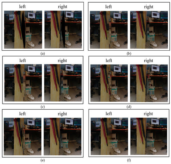 In this subsection, we derive the relationship between the stereo views, where the camera parameters of the warped pictures are utilized. In Figure 4, and are the warped images after they have been taken by the left and right cameras, respectively. Based on the geometric relation between the camera coordinate and world coordinate systems [27], the (X, Y, Z) of point P in the world coordinate system is mapped to the and of points and in and , respectively. The relation is represented as follows.