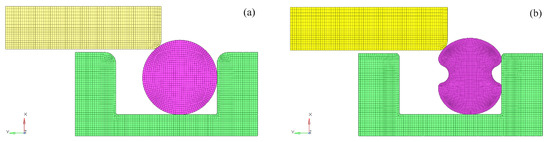 According to the rubber ring of hydraulic buffer used in articulated landing gear, considered the axisymmetric characteristic of geometry and load condition [22,23], the axisymmetric model of rubber O-ring is established with section diameter 7 mm as shown in Figure 2a. Specific geometry size of groove and piston rod are set according to the part 1 of ISO 3601 standard.
