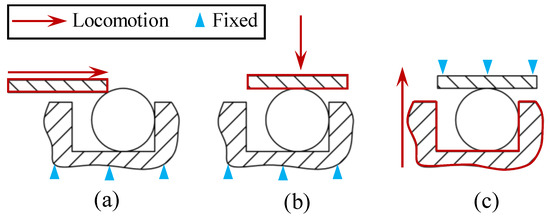 Modeling of installation mode. Three installation modes are used to simulate the process of pre-compression in public literature. RA mode means that the piston rod is applied with axial displacement and the groove is constraint with fixed displacement in (a). And RL mode means that the piston rod is applied with lateral displacement and the groove is fixed still as (b). The mode of GL means that the piston rod is fixed, and the groove is applied with lateral displacement in (c).