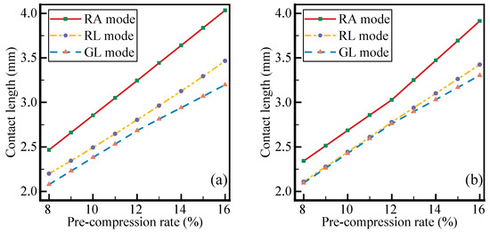 Comparison of installation mode on contact length. The contact lengths of the three installation modes are shown in (a) for piston rod side and in (b) for groove side, respectively. The three installation modes, including piston rod with axial displacement (RA mode), piston rod with lateral displacement (RL mode), and groove with lateral displacement (GL mode). The range of pre-compression rate is set between the maximum and minimum allowable value.