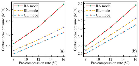 As Figure 7 shown, the regular of contact peak pressure at groove side is much compatible with that at piston rod side. Also, the regular of contact peak pressure at piston rod side and groove side is just like that of contact length. The contact peak pressure under RA mode is higher than that under RL mode and GL mode at piston rod side in Figure 7a. The smallest increase rate is 20% compared with RL under pre-compression rate 8%.