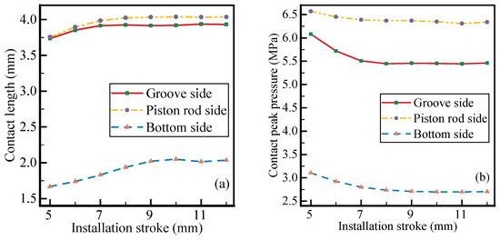 Comparison of installation stroke. The contact length in (a) and contact peak pressure in (b) under eight different installation strokes are compared at three positions, including groove side, piston rod side and bottom side.