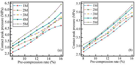 The results of pre-compression rate experiment show that simply increasing the section diameter of the rubber ring cannot effectively increase the contact peak pressure, and properly increasing the pre-compression rate is effective for increasing the contact peak pressure. P. B. Lindley’s research shows that the relationship between compression stiffness and pre-compression rate is approximately a fifth power, so the compression stiffness of different section diameters are approximately equal under the same pre-compression rate. As shown in Figure 9, the contact peak pressure of simulation from 1M to 5M is concentrated in a narrow band. And the first-degree polynomial is used to fit the function of pre-compression rate to contact peak pressure, and the Pearson’s value is above 0.92. Obviously, the contact pressure increased by the pre-compression rate is higher than that by the section diameter.