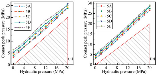 According to the criterion that contact peak pressure should be higher than the hydraulic pressure, the failure zone of seal is defined. As shown in Figure 10a, the contact peak pressures of experiment from 5A to 5E are in the narrow band range of 2.10 MPa to 3.46 MPa. And in the range of hydraulic pressure from 0 to 20 MPa, the contact peak pressures are always distributed outside the failure zone. The relationship between contact peak pressure and hydraulic pressure is fitted as follows: