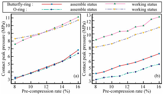 It can be found that the contact peak pressure of butterfly-ring is greater than that of O-ring at the maximum compression rate. When the pre-compression rate is 16%, the contact peak pressure at the groove side of butterfly-ring increases by 14%. And this law holds for both piston rod side and groove side. Moreover, it is worth noting that the proposed butterfly-ring improves the contact peak pressure at groove side and keeps the contact pressure at piston rod side close to that of the O-ring. Specifically, when the pre-compression rate is 8%, the contact peak pressure of butterfly-ring is 0.15 MPa lower than that of O-ring. When the pre-compression rate is 16%, the contact peak pressure of butterfly-ring is 0.45 MPa higher than that of O-ring. When the pre-compression rate is 14%, the contact peak pressure of butterfly-ring and O-ring is basically the same. As a whole, the contact peak pressure of butterfly-ring is close to that of O-ring at piston rod side, as shown in Figure 11a.