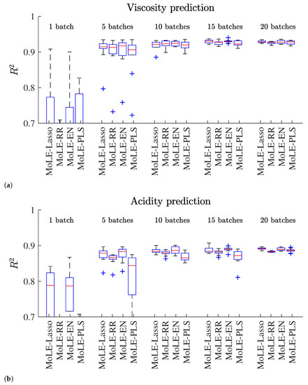 From Table 2, the results of training with 1 batch for resin acidity number prediction, show that MoLE-Lasso performs better with an average . On the other hand, the performance of resin viscosity prediction with 1 batch has better results for MoLE-EN, with a value of . This shows that the resin viscosity can be predicted even with few data for training. From the boxplot, Figure 2, the MoLE-Lasso and MoLE-EN have the lowest variance on resin viscosity prediction, while for resin acidity number the variance of prediction is higher. Figure 2, exhibits that the performance of all models increases with the number of batches used for training, as well the variance decreases. An interesting observation is related to the Mix-PLS performance, which shows a high variance of performance for small batches, which decreases as the number of training batches increases. For 20 batches it performs quite similar to, or even better than, Lasso regularization. This suggests that Mix-PLS can be a valid option when dealing with a large number of samples (in our experiment, more than 400 samples). Overall, RR regularization performs poorly among the experiments. This is reinforced by results in Table 2, where MoLE-RR provides the worst results in the majority of experiments.