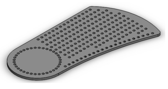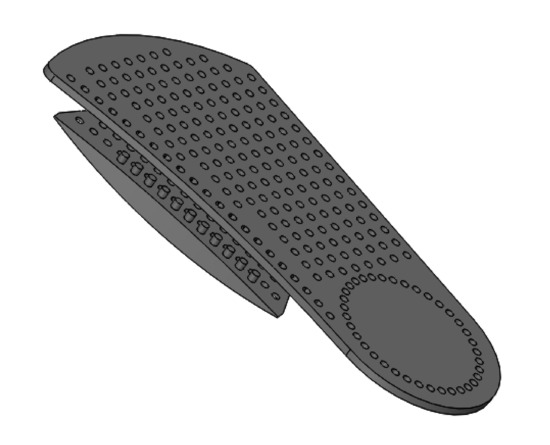 Regarding the characteristics of each subsystem, the plantar base was designed according to the ¾ length type with the intention that the system can be accommodated in the majority of the footwear, given that the biggest challenge of the clinical professionals is not always the prescription of the orthosis, but the adaptation of this orthosis to the patient’s preference of footwear [6]. For this reason, the plantar base can be manufactured in different dimensions in relation to its length and width, as long as its longitudinal termination is maintained up to the metatarsal heads. Regarding the longitudinal arch, it can be manufactured in different heights so that the clinical professional has options regarding the incorporation of this subsystem for the treatment of both supination and desecration of the foot. On the other hand, the metatarsal button subsystem can be incorporated to the plantar base or not. This will depend on the clinician’s evaluation regarding the load on the metatarsal region of the foot. Finally, the rearfoot wedge has the quality to be incorporated either by the lateral or medial part of the heel area of the plantar base. The length of the bolts protruding from the longitudinal arch, metatarsal button, and hindfoot wedge are the same dimension as the depth of the holes in the plantar base, so the bolts do not protrude from it or cause discomfort.