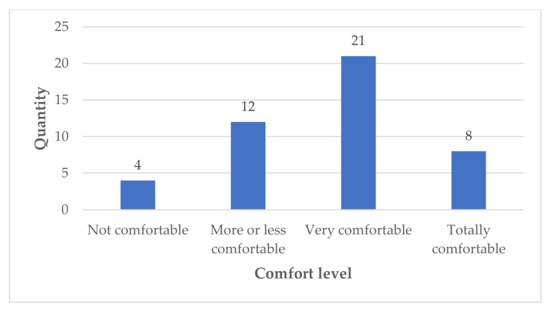 Figure 8 illustrates the level of comfort reported by those 45 patients and it is observed that only 8 (17.77%) described it as very comfortable, 21 (46.66%) declared it comfortable and the rest mentioned that the orthosis allowed opportunity areas to improve.