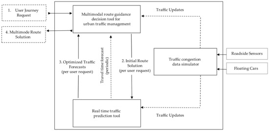We start by giving an overview of the complete architecture that we devised to realize our intelligent transportation system, which integrated three vital software modules. Figure 1 shows the software modules and the fundamental interactions between these modules. The specific modular software tools are (1) the multimodal decision support tool, (2) the traffic congestion data estimator, and (3) the real-time traffic prediction tool. In essence, the multimodal traffic recommender suggests eco-friendly routes after receiving traffic flow forecasts from the real-time traffic prediction tool, an ant-based system for modeling and simulating traffic to predict stream characteristics [55]. This belongs to the class of holonic-based solutions [56]. The Erlang programing language was used to implement the real-time traffic prediction tool as it enables the creation of large-scale real-time systems that run a high number of parallel processes. The forecasts calculated here represent the costs of using transport segments that could take the form of estimated travel time or CO2 emissions. Finally, the traffic congestion data simulator fetches road traffic information from the urban traffic management and control center (i.e., UTMC) every four seconds. Moreover, traffic data can be collected using floating cars (through dedicated in-car WIFI devices) and roadside sensors periodically. The servers of public transport provide live information about their services. The central role of the traffic congestion data simulator is to estimate the level of traffic and amount of CO2 emissions and push these traffic estimations to the other two modules once every 4 s. Data are exchanged between the software modules using XML RPC and SOAP communication protocols. However, in this paper, we focus mainly on describing the multimodal mobility recommender system as it represents the core contribution of our work.