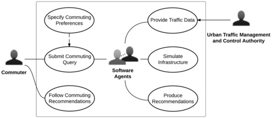 Figure 3 summarizes the main actors that interact with our navigation routing system and describes how the system operates. Our system has three main entities, two located outside the system, namely the commuter and the urban traffic management and control authority (i.e., UTMC), and one located inside the system, namely software agents. The UTMC authority interacts with the system by providing the necessary traffic data at a regular interval. The authority collects static traffic data and real traffic information while considering various modes of transport (e.g., cars, trams, metro, bus, and trolleybus). It passes these data to the transport agents in the system. The commuter interacts with the system by submitting journey/commuting requests and modifying commuting preferences as desired. However, the software agents are responsible for simulating the transportation infrastructure, learning about the traffic characteristics of the environment, producing route recommendations, and responding to commuter queries. The execution of these functions relies on the interactions that take place between different agents in the system.