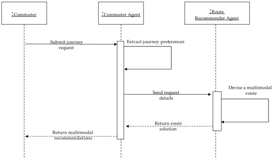 Figure 4 depicts a sequence diagram that explains the interactions between two agents and messages exchanged in order to produce a route recommendation for a commuter. In a nutshell, a sequence diagram captures the key objects of the system and exhibits the order of interaction between these objects during collaboration. The first message of the sequence diagram originates from the commuter who submits a journey request to the commuter agent, normally through a mobile app interface, which in turn reads the serialized message and extracts the commuter preferences, including the source, destination, departure time, and ideal modes of commuting (e.g., bus, metro, cycling, and walking). The commuter agent sends these trip details to the route recommender agent, which deciphers the request and calculates a routing solution given the knowledge it holds about the transport network. Finally, the recommended multimodal route is returned to the commuter mobile phone.