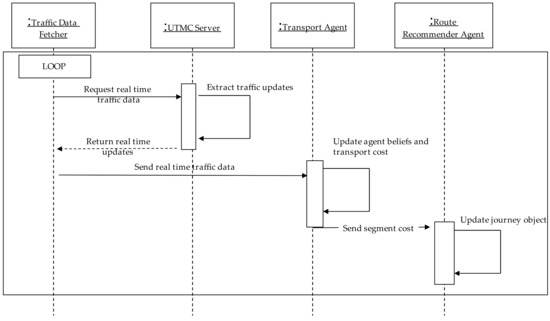 Figure 5 describes the interactions between three agents of the multimodal recommender system and one object outside the system (i.e., urban traffic management and control server) to update the agents’ internal state or knowledge base about the current situation of the transport network. This ensures that routing decisions are derived based on the latest status of the transport network. The traffic data fetcher, which plays the role of a sensing agent, requests real-time traffic data, e.g., from the UTMC server, which extracts and processes the raw sensory data and replies with the live traffic status (e.g., traffic density, average travel times, carbon emissions (g/m)) about the urban environment. Next, the traffic data fetcher forwards this information to the respective transport agents, which simulate the physical layers of the network. Only once the traffic updates become available, the traffic data fetcher agent sends these updates to the designated transport agents. Consequently, each transport agent updates its beliefs about the traffic network and its internal costs (i.e., estimated travel time and transport emission). Each transport agent sends a message containing the costs of using the transport segment that it represents to the route recommender agent, which in turn updates a table of journey objects holding the costs of all transport segments of the city being modeled. This table of journey objects is searched to retrieve the fastest or eco-friendliest routes depending on user queries. It is worth noting that this interaction sequence is repetitive. Therefore, the transport agents are updated with the status of traffic conditions every τ minutes.