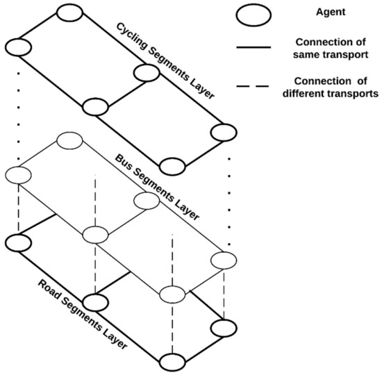 The proposed architecture is capable of simulating a complex urban transport network with its varied transport layers. In effect, a physical transport layer can be defined as a set of interconnected segments. Figure 6 depicts the seven layers that are modeled by the software agents. These transport layers cover road segments, public transport (bus, trolleybus, metro, tram) segments, bicycle segments, and walking segments. As shown in Figure 6, each mode of transport is represented by agents in a layer, which can interact with a segment of other layers (i.e., a different transport mode). So, an agent is connected to agents of the same type (i.e., same transport mode) and agents of other types (i.e., different transport mode) to enable multimodal collaboration.