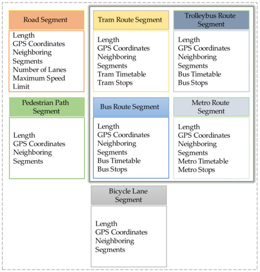 Various agent types are used to model the traffic network, where each agent, referred to as a transport agent in our study, can be used to simulate one type of transport mode, e.g., buses, trolleybuses, metros, trams, bicycles, and walking. The transport map is divided into interconnected segments where each software agent simulates a single transport link instead of the whole roads. Consequently, multiple transport network layers are created (e.g., road network, bus network, and so on) by the system. The agents hold different static and dynamic information about the traffic. Despite their differences, these agents interact and collaborate to assist in the creation of the most appropriate multimodal route while considering user preferences and traffic conditions. Figure 7 highlights the exact properties of each agent while simulating various transport modes. Every agent will aim to keep commuters’ demands within the capacity of the segment it models.