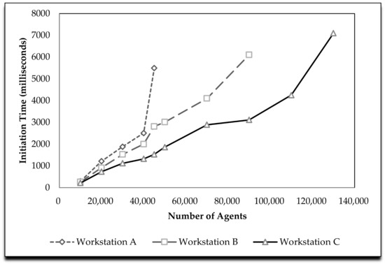 We tested the initiation of software agents in three different workstations, namely, machine A (with the following technical specifications: 2.7 GHz Opteron VM, 2 GB, Linux, 32-bit), machine B (with the following technical specifications: 2.8 GHz Intel Core i5, 2 GB, Linux, 32-bit), and machine C (with the following technical specifications: 3.1 GHz Intel Core i5, 4 GB, Win-7, 64-bit). Figure 8 shows that machine C creates more software agents (140,000 agents) in the environment than machine B (90,000 agents) and machine A (45,000 agents). This might be explained by the larger memory size of machine C. Moreover, machine C creates more agents than machine B and A for the same execution period. Within 2 s, machine C initiated approximately 56,000 agents, while machine B initiated 40,000 agents and machine A initiated 32,000 agents. This technical testing demonstrated the suitability of AGlobe in creating agent-based environments that are appropriate for modeling urban cities within reasonable times.