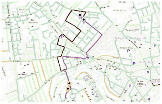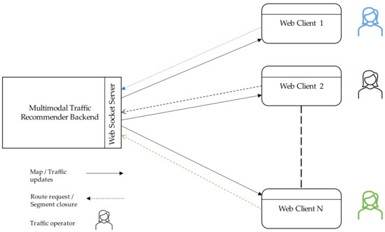 Recent traffic modeling systems addressed traffic management problems by integrating multiple modes of transport and considering eco-friendliness [44,45,46,47]. For example, a multi-agent decision support framework used the genetic algorithm to optimize transport graphs and recommend the best combination of transport modes to commuters [45]. However, our route recommender architecture simulates the transport network at a macroscopic level, i.e., creating transport agents for every road segment and considering real-time traffic information for them, and thereby provides more accurate estimations of the traffic situation, aggregation of travel times, and travel carbon emissions. In addition, our system encourages sustainable transport modes, such as walking and cycling, which can expand on co-modality and multi-modality.