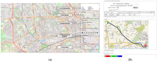 (a) A visualization web client for the traffic management center operators, with Open Street Map (OSM) set to Nottingham (United Kingdom). (b) K-shortest path planner tool.