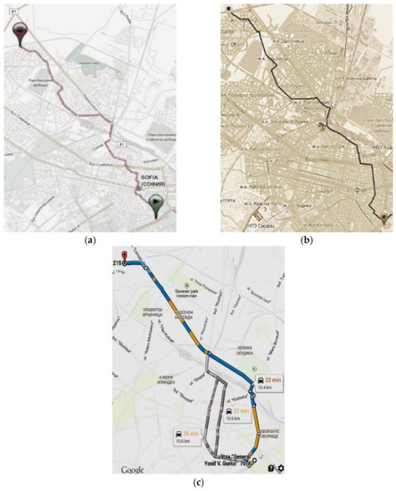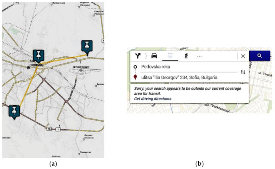 Figure 11 depicts the road segments, public transport segments, and public transport stops in the city of Sofia (Bulgaria). Different colors are used to depict the level of traffic congestion (heavy, medium, low) in the transport segments of the designated city. The regular traffic updates can be seen on the OSM map or verified through the log files. Moreover, the visualization tool provides a mechanism to test the quality of route recommendations. To this end, one can submit a commuting request that comprises a source and destination, departure time, and selected modes of transport. The submitted journey request is then passed to the route recommender agent for handling.
