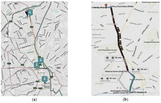 The provided web clients empower traffic operators to observe the traffic conditions of different modes of transport and test various scenarios to check the impact of their decisions. These clients are accessible using popular web browsers, e.g., Chrome, without the necessity to install any third-party software. The visualization interface comprises a total of five useful sections and features, as depicted in Figure 10a. The top section shows a pre-defined list of cities (for example, Sofia in Bulgaria, Coventry and Nottingham in the United Kingdom) to be simulated by the multiagent traffic management system. The second section enables the operator to submit a route request, containing some commuting preferences, such as the trip origin, trip destination, and type of route desired. The returned results yield the best route that satisfies these preferences, a mix of modes of transport, and estimated travel time and carbon emissions of the journey. The third section overlays the selected transport networks on top of the OSM map. The forth section allows the traffic operator to manipulate the traffic forecasts within a 30 min window and show various traffic attributes. The fifth and last section can be used to inspect specific route solutions. Furthermore, the traffic operators are supplemented with a k-shortest paths planner tool to simulate traffic conditions (e.g., number of vehicles, type, departure time) and observe its instant impact on route planning and guidance (Figure 10b).