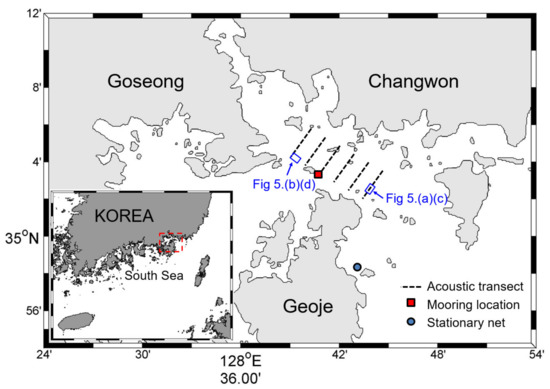 Study area in Jinhae Bay, Korea. The acoustic survey transects are shown as black dotted lines, and the locations of the echosounder mooring are indicated by red squares. The circle represents a stationary net station for fish catches.