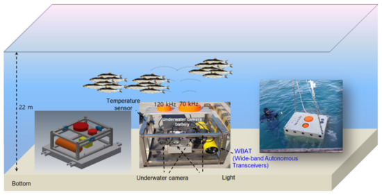 For the operation of the moored echosounder, an underwater mount (100 cm width × 100 cm length × 65 cm height) was made and installed in the waters near Jam Island in the bay (35°3.543′ N, 128°40.613′ E), which is part of the migratory path of the adult Pacific herring, in its movement to the spawning and habitat grounds of the larvae (Figure 1). This underwater mount was installed and fixed at a depth of 22 m by scuba diving, and the mooring split-beam wideband autonomous transceivers (WBATs) (SIMRAD AS) installed on the mount were operated by an internal battery (128 Ah) with split-beam transducers of 70 kHz (model ES70-7CD) and 120 kHz (model ES120-7CD) (Figure 2). With the sensors facing the surface layer, acoustic data were obtained from all water columns, from near the sea floor to the surface. The moored echosounder was operated for about 70 days from 21 January (winter) to 31 March (spring) 2018, when the Pacific herring returned for spawning. During the deployment, the WBATs were programmed to transmit an ensemble of 100 pings at the beginning of each hour at a ping interval of 3 s. The pulse width of the transmitted signals was set to 1.024 ms for both frequencies, and the Tx power was operated at 375 W and 200 W for 70 kHz and 120 kHz, respectively, depending on the water depth. A water temperature and depth logger (RBR T.D duet, RBR Ltd.) was installed on the underwater mount to supplement the acoustic data analysis. The water temperature data were collected at intervals of 2 min for the same period as the echosounder.