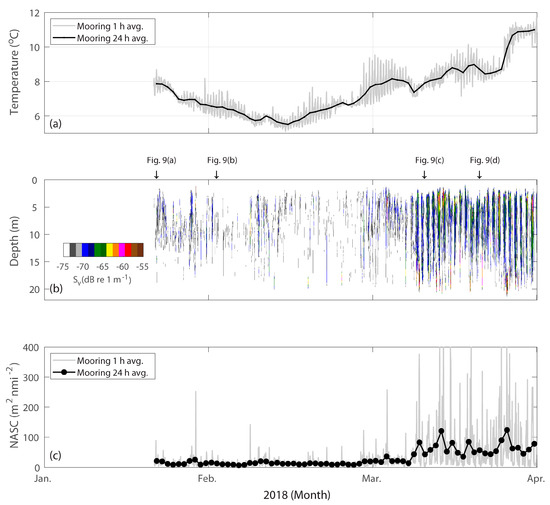 The bottom water temperature logged by the moored echosounder at a depth of 22 m was measured in the range of 5.11–11.68 °C (average, 7.47 °C) during the mooring period from 21 January to 31 March 2018 (Figure 4a). When the mooring was installed, the bottom water temperature was 7.9 °C on 21 January 2018, which decreased to below 5.5 °C by 15 February 2018. Since then, the water temperature had risen to 11 °C or higher by the end of March 2018.
