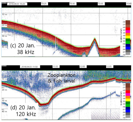 Figure 5 shows an example of acoustic data acquired from a ship-based echosounder by frequency. The survey of the transects obtained using the ship-based echosounder in January 2018, which is the winter season, detected many fish school echoes of −51 to −33 dB in the transects outside Jinhae Bay, at a low frequency of 38 kHz (Figure 5a). On the other hand, at a high frequency of 120 kHz, only weak signals of −60 dB or less were detected at the inner bay (Figure 5b). In spring, even at the outer bay, few acoustic signals from fish schools were detected at 38 kHz (Figure 5c), while acoustic signals of fish larvae and zooplankton in the range of −65 to −55 dB were received at 120 kHz at the inner bay, unlike the survey in winter (Figure 5d).