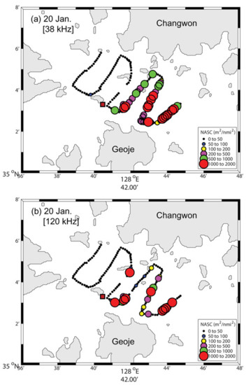 After the acoustic data obtained from the survey areas were separated into echoes of adult fish and larvae and zooplankton using the difference in mean volume backscattering strength, the extracted 38 kHz fish echoes and 120 kHz zooplankton echoes, including larvae, were converted into NASC and displayed on the transects (Figure 6). In January, few fish echoes were detected inside Jinhae Bay, while a relatively higher level of acoustic backscatter intensity was measured outside the bay (Figure 6a). On the one hand, larval and zooplankton signals were low across the bay (Figure 6b). In April, strong signals from adult fish were intermittently detected only outside the bay, and the frequency was relatively low compared to that obtained in winter (Figure 6c). On the other hand, larval and zooplankton signals were detected across the survey areas, unlike in winter, particularly strongly inside the bay (Figure 6d).